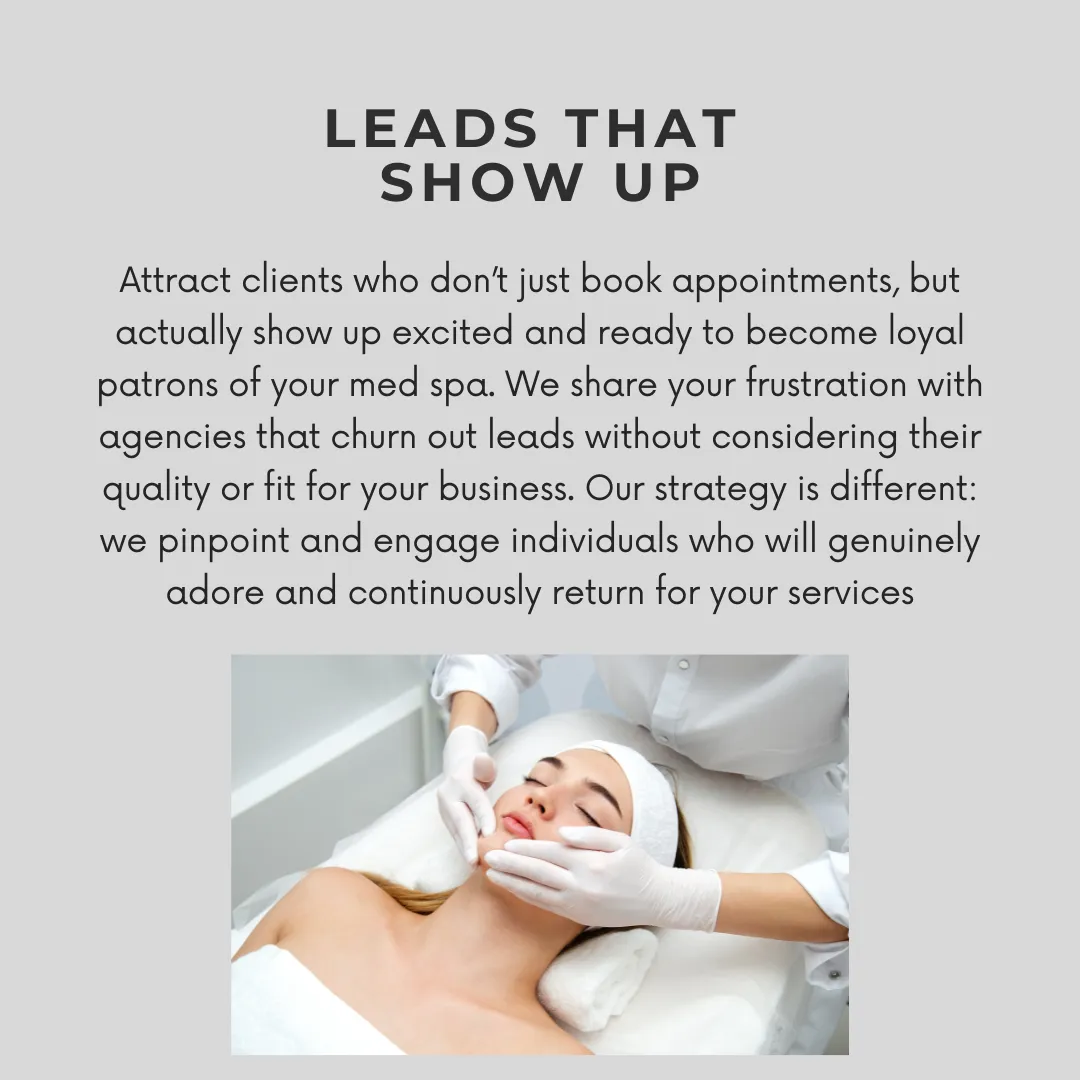 Don't settle for agencies that just toss a list of names your way and call it a day. Our system is built differently. We follow up, we nurture, and we care about turning those clicks into loyal clients who love returning to your spa.